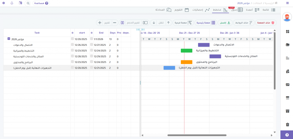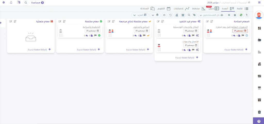 مرونة العرض وأتمتة العمل: سواء كنت تفضل مخطط غانت (Gantt Chart) أو لوحات كانبان (Kanban) التفاعلية، يوفر النظام مرونة كاملة مع واجهة عربية 100% وأدوات أتمتة ذكية لتقليل العمل اليدوي وتبسيط سير العمل اليومي.