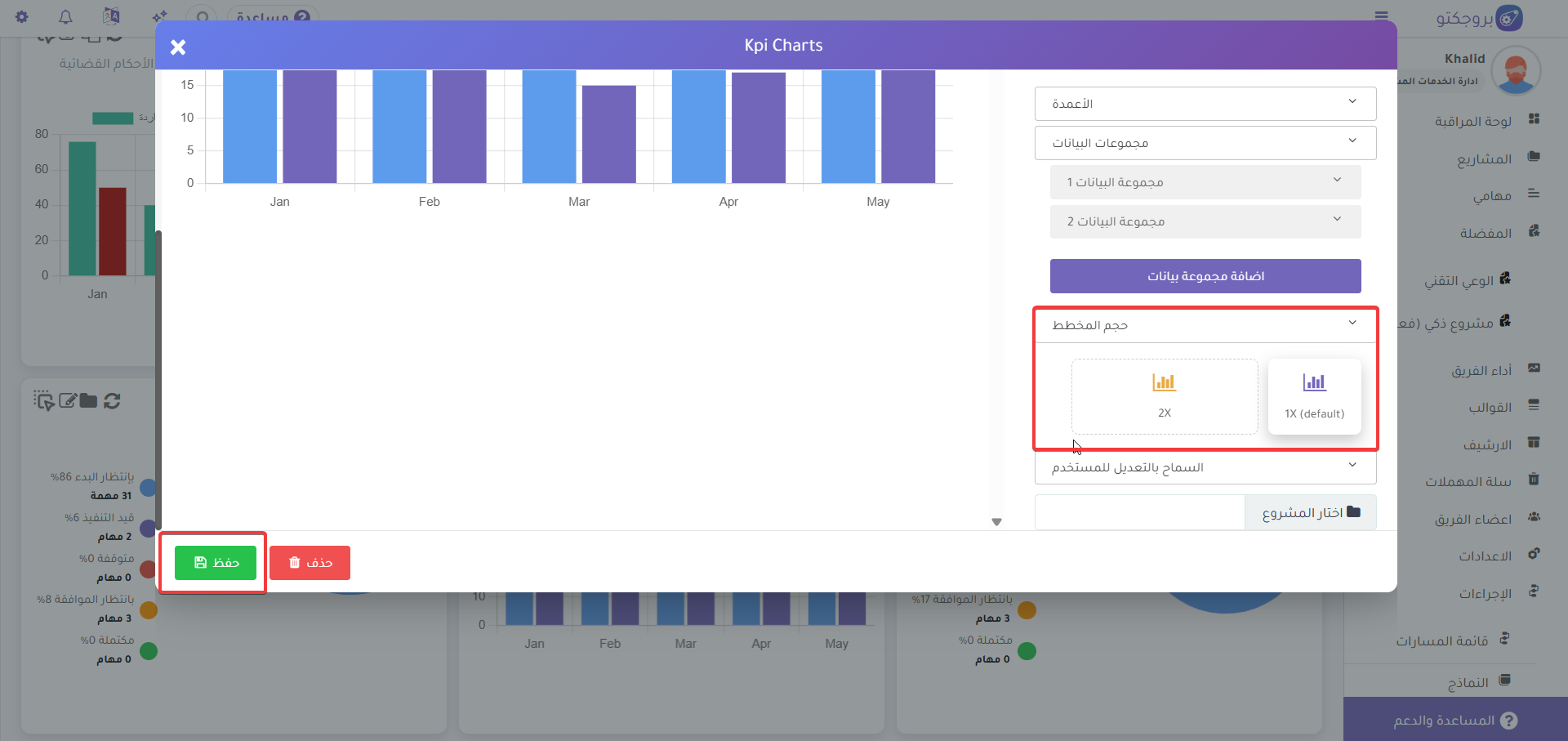 استخدم خيار “حجم المخطط” لتناسب الرسم البياني مع مساحة الشاشة في لوحة المراقبة الخاصة بك. تذكر أن الهدف من الـ KPI Chart هو تقديم إجابة فورية على سؤال: “هل نحن نحقق أهدافنا؟” بمجرد النظر إلى توازن الأعمدة.
